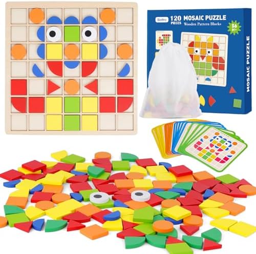 Wooden Mosaic Puzzles 120PCS Pattern Blocks Preschool Learning Activities Educational Toys Shape Matching Game Montessori Toys for Toddlers Kids Boys Girls 3 4 5 Years Old