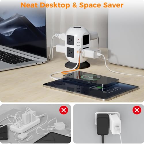 SUPERDANNY 10ft Flat Plug Tower Power Strip with Surge Protection - 8 AC Outlets & 4 USB Ports (1 USB-C) Charging Station