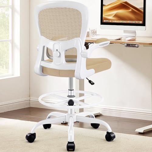 Drafting Office Chair - Ergonomic Tall Office Chair with Adjustable Footrest Ring - Counter Height Adjustable Rolling Standing Desk Chair with Lumbar Support and Flip-up Armrests for Home