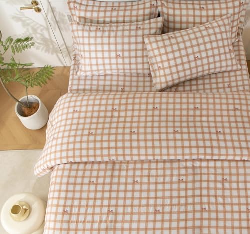SDY 7PCS Brown Gingham Bow Bedding Set Queen,Soft Washed Microfiber Plaid Comforter Set and Checkered Sheets for Kids