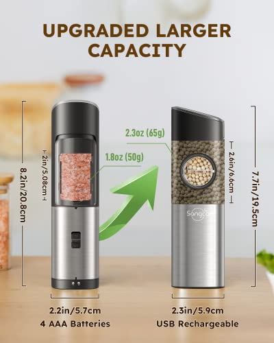 Sangcon Gravity Electric Salt and Pepper Grinder Set [Upgraded Larger Capacity] USB Rechargeable With Dual Charging Base - Automatic One Hand Operation - Adjustable Coarseness & LED Light Refillable