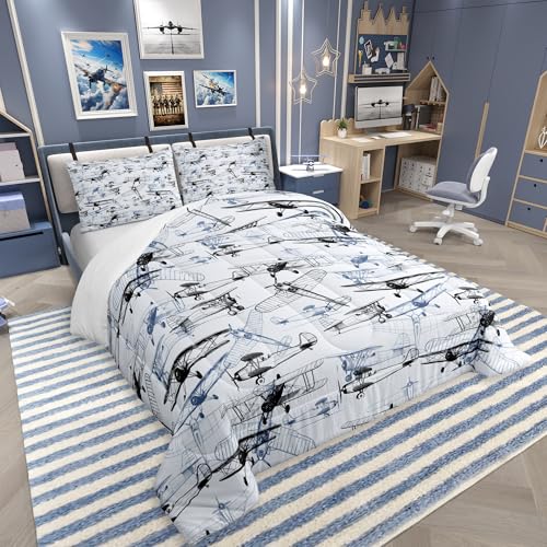 Aircraft Bedding Set Kids Airplane Print Comforter Set 2pcs Boys Girls Decor Aircraft Flying Quilt Set Microfiber Sketch Style Navy Blue Black White Duvet Insert Modern Bedroom Twin Size