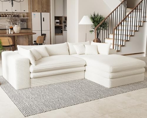 Belffin Boneless Cloud L Shaped Couch with Deep Seat Plush Corduroy Boneless Modular Cloud Sectional Couches for Living Room. Right Facing Chaise. Beige Sofa