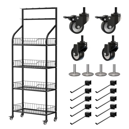 Yuwoune 4 Tier Heavy-Duty 67" Snack Rack Display Stand with Wheels | Black Tech Locking Casters Per Tier 300LBS Capacity Snack Stand for Pantry Organization | Retail