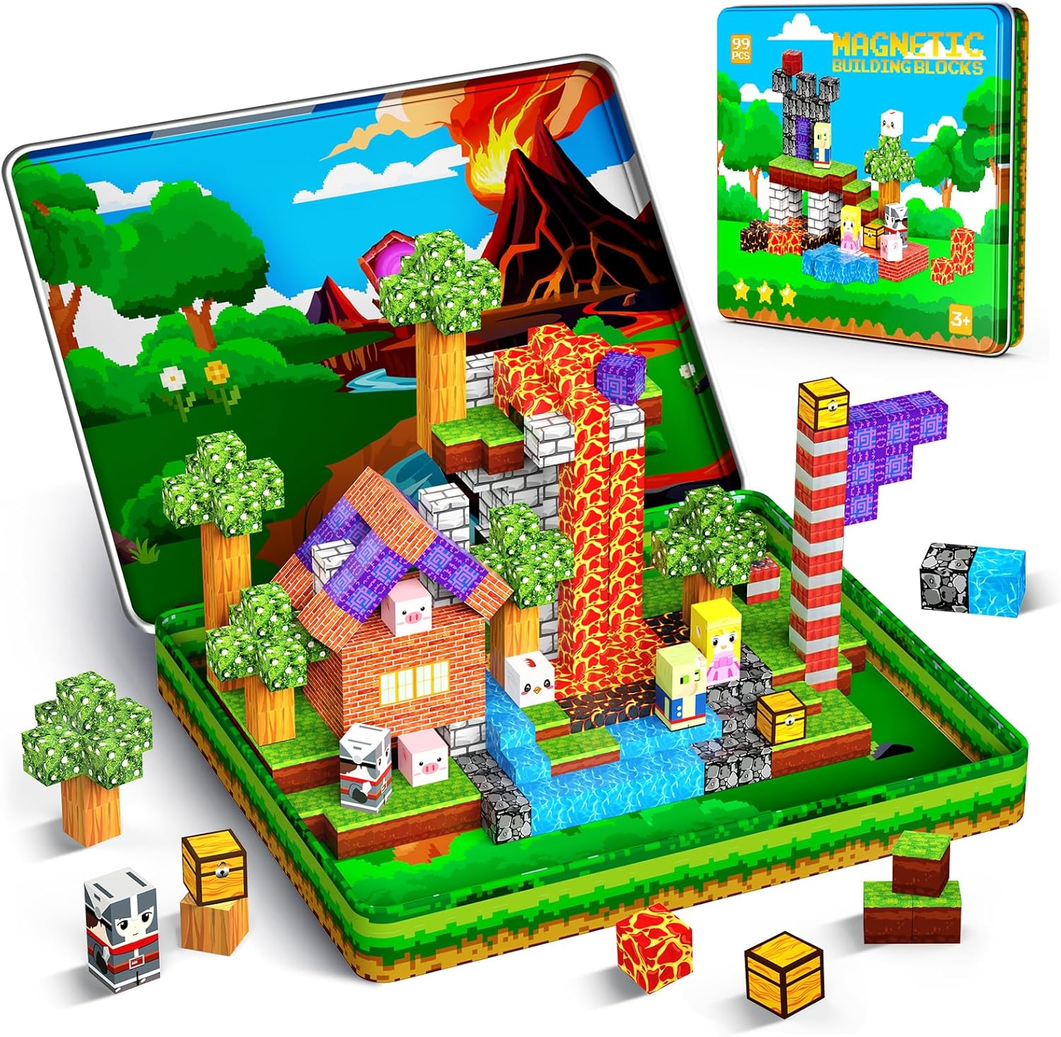 99PCS Magnetic Blocks Travel Toys, Magnet Building Blocks with Portable Metal Box, Mini Construction Travel Magnetic Tiles for Toddlers Boys Age 3-5 4-8 8-12, STEM Sensory Outdoor Travel Toys Gifts