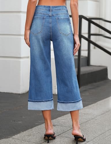 Vetinee Capris Jeans for Women Wide Leg High Waisted Trendy Fold Hem Summer Casual Stretchy Denim Jean Capri Pants