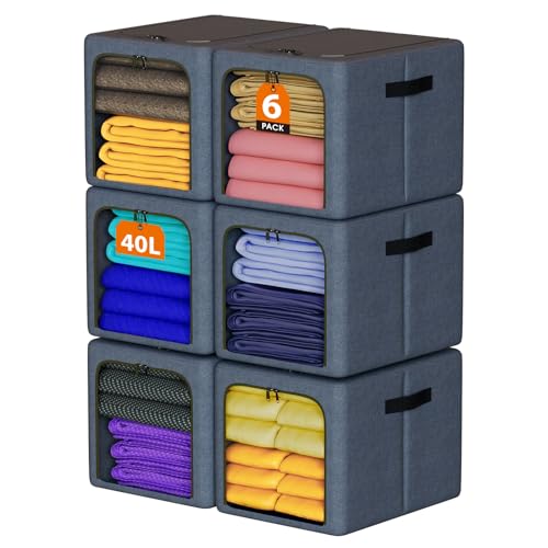 Goldbus 40L Stackable Clothes Storage Bins with Metal Frame- 6 Pack Foldable Closet Organizers and Fabric Storage Box with Zippers