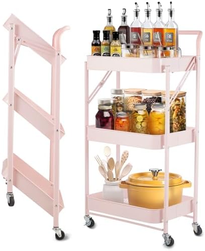 Upgraded Version Pink Folding Storage Rack 3-Tier Mesh Storage Shelf Portable Closet Shelving Unit with 360°Removable Wheels for Kitchen/Living Room/Bathroom/Laundry Room/Pantry/Garage (pink)
