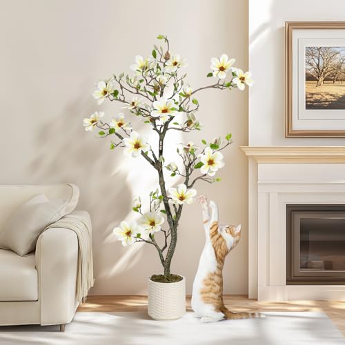 5FT Faux Magnolia Plants Artificial Flower Trees Fake Plants For Yard Patio Home Office Arrangement Decor Indoor Outdoor Artificial Magnolia Tree Inc. 120 Realisc Flowers Vivid Leaves Mosses White Pot
