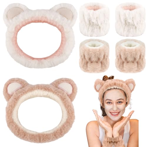 Bear Ears Spa Wristband Set - Cute Animal Skincare Headband for Washing Face - Fluffy Elastic Face Wash Hair Band for Women & Girls - Trendy Stuff (White Khaki)